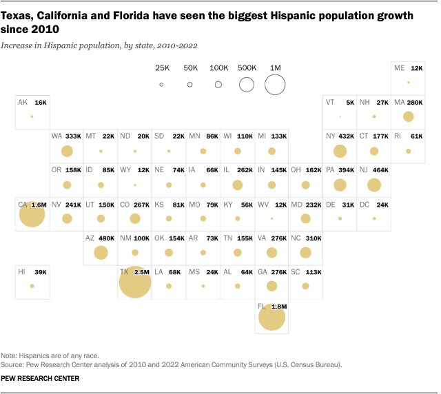 In 2024, 16.1 million Hispanics lived in California, more than in any other state. And 12.6 million lived in Texas, the second-largest Hispanic population by state.