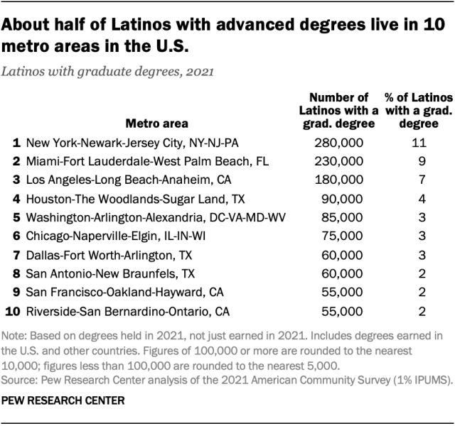 Nearly half of all Hispanics with graduate degrees (48%) live in 10 metro areas. In fact, more than 500,000 Latinos with graduate degrees live in just two metro areas: New York (280,000) and Miami (230,000).