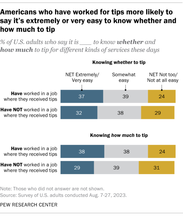 Adults who have ever worked in a job where they received tips are more likely than those who have not to say it’s very or extremely easy to understand tipping etiquette. About four-in-ten adults in this group (38%) say it’s very or extremely easy to know how much to tip for different kinds of services these days, compared with 29% of those who have never worked a job with tips. Adults who have worked for tips are also slightly more likely to say it’s very or extremely easy to know whether to tip at all (37% say this, compared with 32% who’ve never worked for tips).