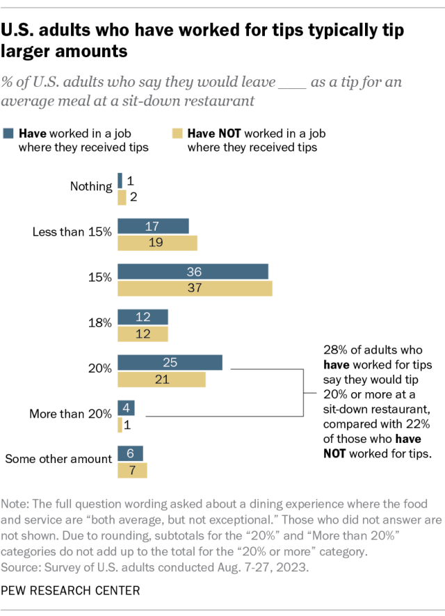 Among those who have worked for tips, about three-in-ten (28%) say they would leave a tip of 20% or more in this situation. By comparison, roughly two-in-ten adults who haven’t worked for tips (22%) say they would tip that amount.