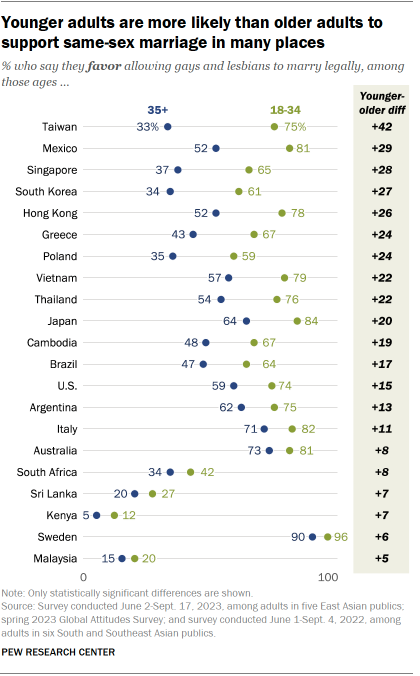 The age gap is greatest in Taiwan. Three-quarters of Taiwanese adults under 35 express support for same-sex marriage, compared with roughly a third of those 35 and older.