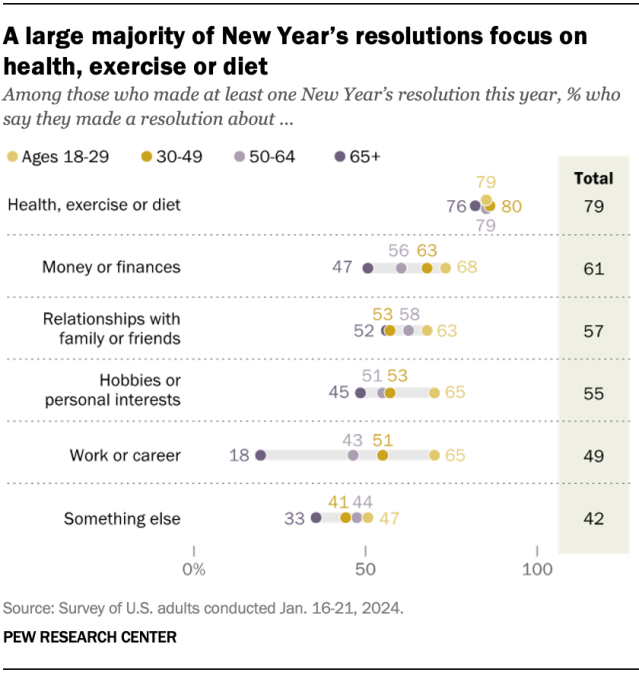 Across all age groups, sizable majorities of those who made resolutions this year say their goals focus on health, exercise or diet.