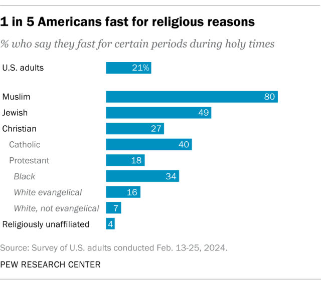 In the United States, 21% of adults overall say they fast for certain periods during holy times, according to a Pew Research Center survey from February. Muslim Americans are by far the most likely to say they fast for religious reasons, followed by Jewish Americans, Catholics and Black Protestants.