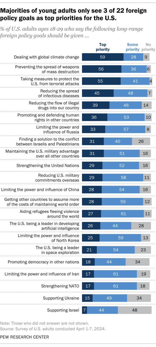 When it comes to other foreign policy goals, the April survey finds 34% of young adults say that supporting Ukraine should not be a priority, and an identical share say this about promoting democracy in other nations.