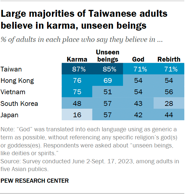 People in Taiwan are consistently more likely than those in the other places surveyed to express spiritual or religious beliefs. For instance, 87% of people in Taiwan believe in karma, compared with 48% in South Korea.