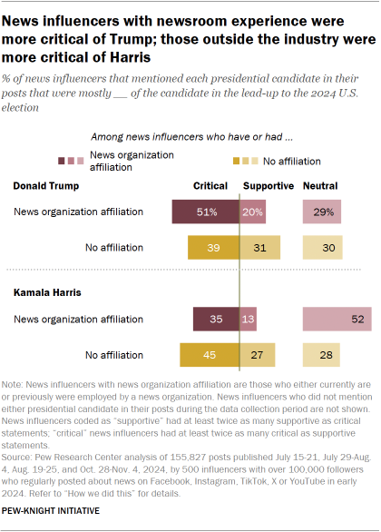 Before the election, news influencers with a connection to the news industry tended to be more critical than supportive of both candidates. But they were more likely to take a side when discussing Trump, while the largest share of influencers who mentioned Harris were generally neutral.