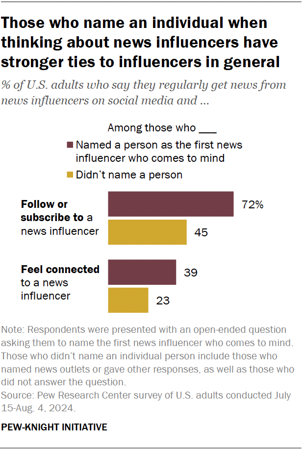 Respondents who named a person also are more likely than other respondents to report feeling a personal connection to a news influencer: 39% say this, compared with 23% of those who did not name a person or did not respond to the question.