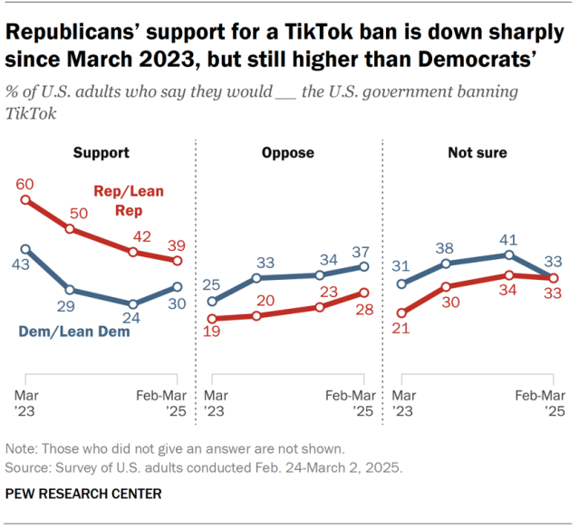 Support for a TikTok ban has declined overall in both parties since March 2023, but Republicans remain more likely than Democrats to back the idea (39% vs. 30%). Still, the share of Democrats who support a ban has ticked up slightly since last summer.
