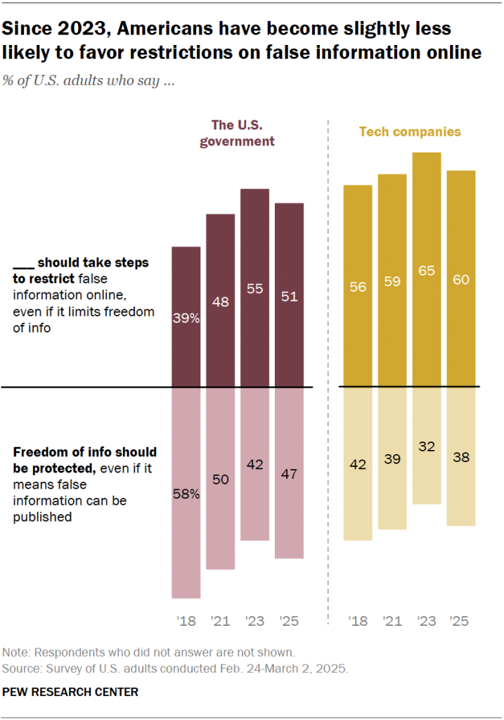 DownloadSince 2023, Americans have become slightly less likely to favor restrictions on false information online ← Prev Page 1 2 3 4 5 Next Page →