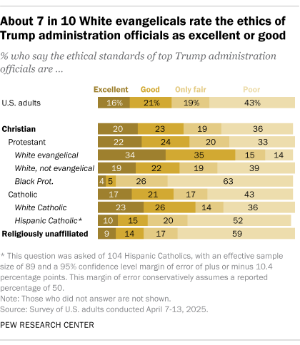 Around seven-in-ten White evangelicals rate the ethics of top Trump administration officials as good (35%) or excellent (34%). By contrast, among the public overall, most (62%) rate the ethics of the Trump administration as only fair or poor.
