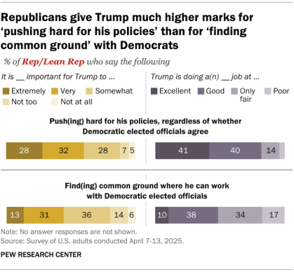 Six-in-ten Republicans say it is extremely (28%) or very (32%) important for Trump to push hard for his policies, regardless of whether Democratic elected officials agree. And 81% of Republicans say Trump is doing an excellent (41%) or good (40%) job at this.