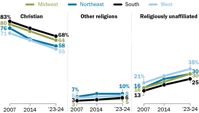 The share of people who collectively identify with religions other than Christianity has increased slightly in each region. In the South, for instance, that share has grown from 3% in 2007 to 6% in 2023-24. In the Northeast, it has increased from 7% to 10%.