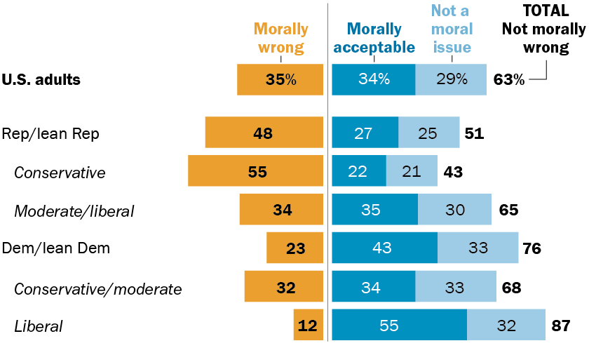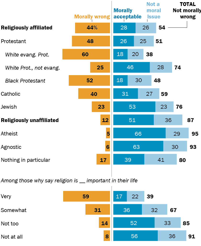 The vast majority of religiously unaffiliated adults, including 95% of atheists and 93% of agnostics, express no moral opposition to the practice.