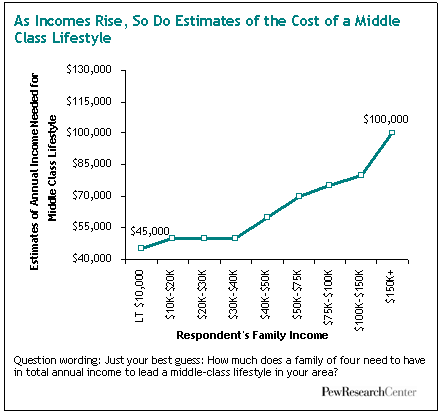 Along these same lines, when survey respondents are asked how much money they think it takes for a family of four to lead a “middle-class lifestyle” in their area, their answers array along a sliding scale that correlates with their income. The greater the income, the higher the estimate. Thus, adults in families whose income is between $100,000 and $150,000 a year believe, on average, that it takes $80,000 to live a middle-class life in their area. By contrast, adults in families whose income is less than $30,000 a year believe that a middle-class lifestyle can be had for about $50,000 a year. Analyzing these estimates by the ZIP codes of the respondents yields a similar finding: people who live in communities with a high cost of living think it takes, on average, about $15,000 more to be in the middle class than do people who live in communities with a low cost of living.