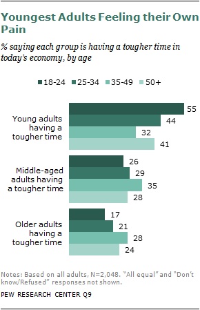 Young adults themselves have a very clear sense that they have suffered more than other age groups as a result of the nation’s recent economic struggles. Fully 55% of those ages 18 to 24 say young adults are having the toughest time in today’s economy. Roughly one-in-four (26%) say middle-aged adults have had a tougher time, and only 17% say older adults have struggled most.