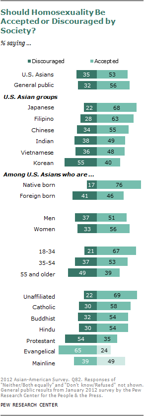 Asian Americans’ views about homosexuality are similar to the views of the general public. Overall, 53% of Asian Americans say homosexuality should be accepted by society, and 35% say it should be discouraged.