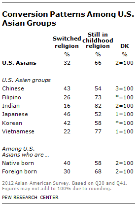Religious switching is more common among native-born Asian Americans than among foreign-born Asian Americans. Among those born in the U.S., 40% have a religion different from the one in which they were raised. Among foreign-born Asian Americans, this figure is 30%.