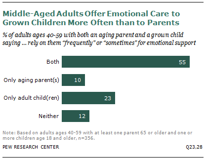 When it comes to emotional support, grown children are more dependent than aging parents. Among adults ages 40 to 59 with both grown children and aging parents, 78% say their grown children rely on them “frequently” or “sometimes” for emotional support, while 65% say the same about their aging parents.