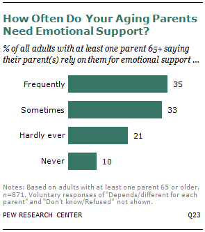 About a third (35%) of all adults with at least one parent age 65 or older say at least one parent relies on them “frequently” for emotional support. Another third (33%) says their parent relies on them “sometimes.”