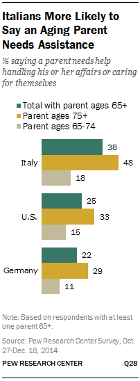 Italians are more likely than Americans and Germans to say an aging parent needs help. About four-in-ten Italians (38%) with at least one parent age 65 or older say their parents need help handling their affairs or caring for themselves, compared with 25% in the U.S. and 22% in Germany.