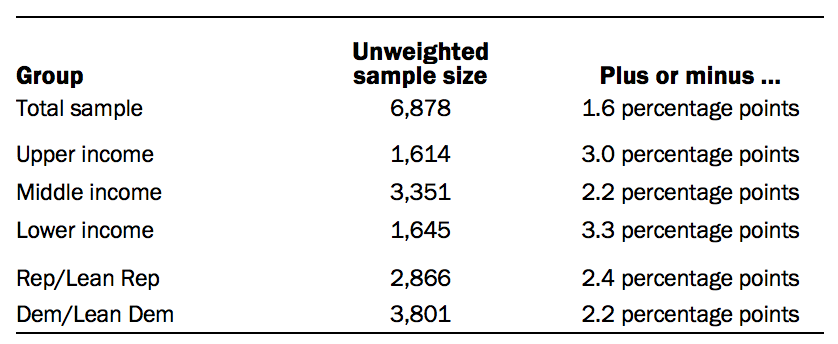 “Middle-income” adults live in families with annual incomes that are two-thirds to double the median family income in this ATP sample, after incomes have been adjusted for household size and the local cost of living. The median family income for this sample is about $34,749. Using this median income, the middle-income range is about $40,100 to $120,400 annually for a three-person household. Lower-income families have incomes less than roughly $40,100 and upper-income families have incomes greater than roughly $120,400 (all figures expressed in 2018 dollars).