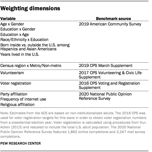 The ATP data was weighted in a multistep process that accounts for multiple stages of sampling and nonresponse that occur at different points in the survey process. First, each panelist begins with a base weight that reflects their probability of selection for their initial recruitment survey (and the probability of being invited to participate in the panel in cases where only a subsample of respondents were invited). The base weights for panelists recruited in different years are scaled to be proportionate to the effective sample size for all active panelists in their cohort. To correct for nonresponse to the initial recruitment surveys and gradual panel attrition, the base weights for all active panelists are calibrated to align with the population benchmarks identified in the accompanying table to create a full-panel weight.