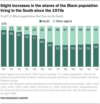 Starting in 1970, shares of the Black population who live in the South have grown. There has been a 4 percentage point increase in the shares of the Black population who live in the South between 1970 (52%) and 2019 (56%).