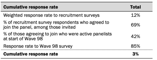 Among the panelists who completed the survey, this weight is then calibrated again to align with the population benchmarks identified in the accompanying table and trimmed at the 1st and 99th percentiles to reduce the loss in precision stemming from variance in the weights. Sampling errors and tests of statistical significance take into account the effect of weighting.
