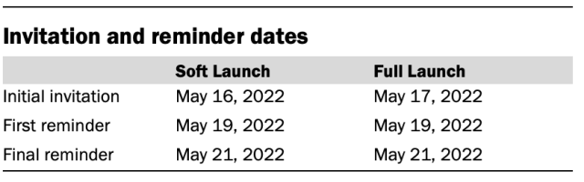 Invitations were sent out in two separate launches: Soft Launch and Full Launch. Sixty panelists were included in the soft launch, which began with an initial invitation sent on May 16, 2022. The ATP panelists chosen for the initial soft launch were known responders who had completed previous ATP surveys within one day of receiving their invitation. All remaining English- and Spanish-speaking panelists were included in the full launch and were sent an invitation on May 17, 2022.