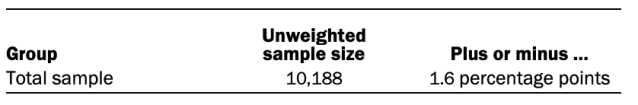 Sample sizes and sampling errors for other subgroups are available upon request. In addition to sampling error, one should bear in mind that question wording and practical difficulties in conducting surveys can introduce error or bias into the findings of opinion polls.