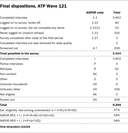To ensure high-quality data, the Center’s researchers performed data quality checks to identify any respondents showing clear patterns of satisficing. This includes checking for very high rates of leaving questions blank, as well as always selecting the first or last answer presented. As a result of this checking, two ATP respondents were removed from the survey dataset prior to weighting and analysis.