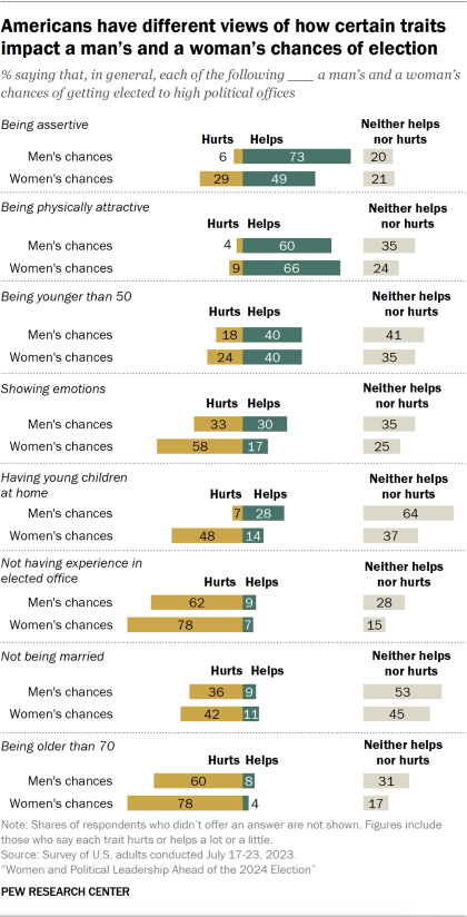 The survey asked how certain traits impact a man’s or a woman’s chances of getting elected to high political offices.