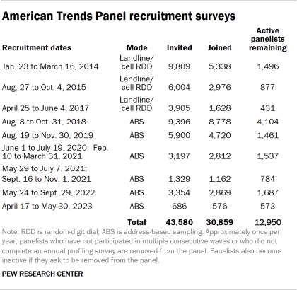 Across the six address-based recruitments, a total of 23,862 adults were invited to join the ATP, of whom 20,917 agreed to join the panel and completed an initial profile survey. Of the 30,859 individuals who have ever joined the ATP, 12,950 remained active panelists and continued to receive survey invitations at the time this survey was conducted.
