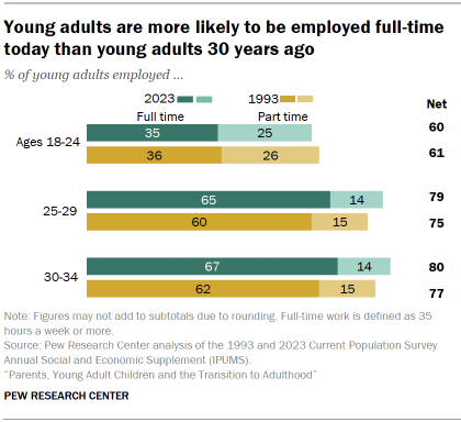 While there hasn’t been a significant change among young adults ages 18 to 24, the share employed full time among young adults ages 25 to 29 increased from 60% in 1993 to 65% today. Similarly, among those ages 30 to 34, it rose from 62% to 67%.
