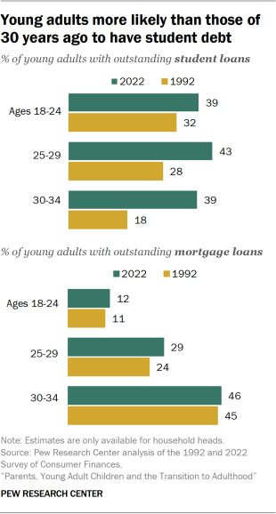 Among those ages 25 to 29, the share with student loans rose from 28% in 1992 to 43% in 2022, and the increase was even greater for 30- to 34-year-olds (from 18% to 39%). The change from 32% to 39% among those ages 18 to 24 is not statistically significant.