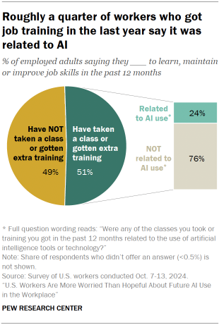 At the time of our October 2024 survey, about half of workers (51%) said they had taken a class or gotten extra training for work in the prior 12 months. Within this group, about a quarter (24%) say a training they took was related to AI use.