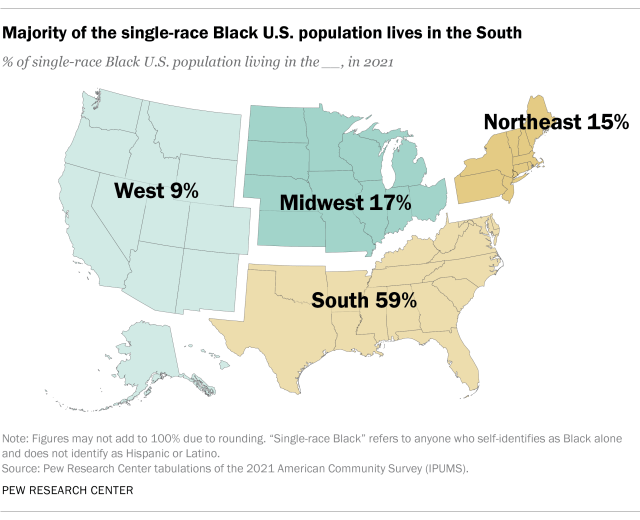 The South has the highest concentration of single-race, non-Hispanic Black residents: 59% live there as of 2023. The Midwest is home to 17%, while another 15% live in the Northeast and 9% live in the West.